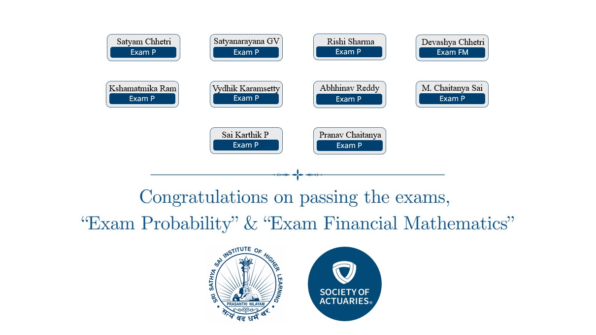 The Sri Sathya Sai Institute of Higher Learning (SSSIHL) proudly congratulates its students on their outstanding success in the professional actuarial examinations conducted by the Society of Actuaries (SOA).